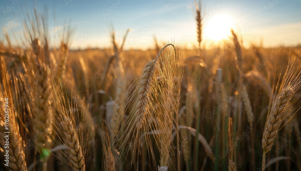 >Fototapety na wymiar>Wheat Field Rye, close-up of wheat ears, signifies the harvest season's bounty, highlighting the importance of agricultural productivity