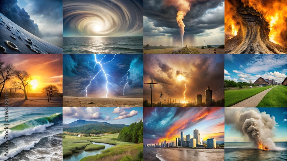 Fototapeta na wymiar - Extreme Weather Events Collage PNG - Hurricanes, Tornadoes, and Heatwaves Depicting Climate Change Impact.