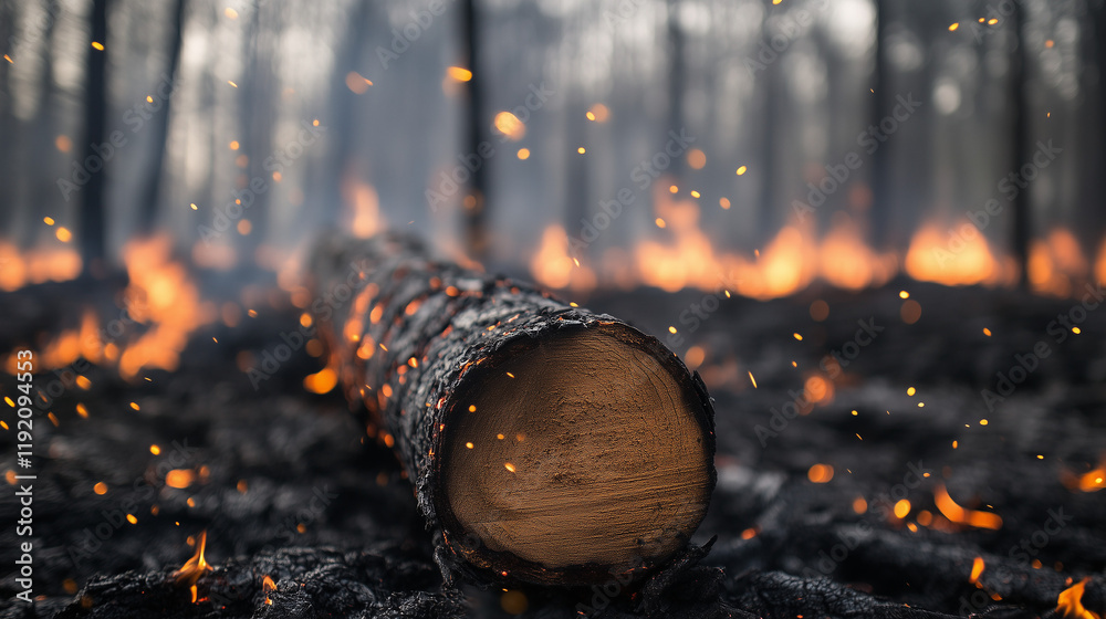 Fototapeta na wymiar - Forest Fire Aftermath: A close-up shot of a charred log amidst the smoldering embers of a recent forest fire, the flames dancing in the background..