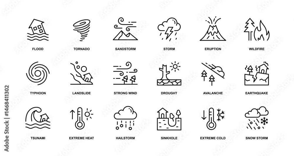 Fototapeta na wymiar - Minimalist Icons of Natural Disasters with Editable Stroke.