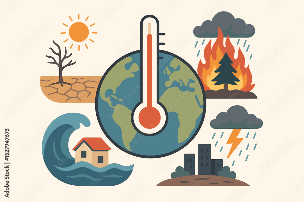 Fototapeta na wymiar - Climate change concept vector illustration. Global warming awareness. Planet Earth with thermometer showing high temperature. Natural disasters: flood, drought, wildfire, storm, tsunami..