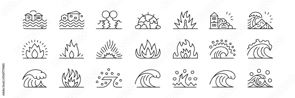 Fototapeta na wymiar - Natural disaster Line Icons Set, Earthquake, Tsunami, Fire, Flood, Line Drawing.