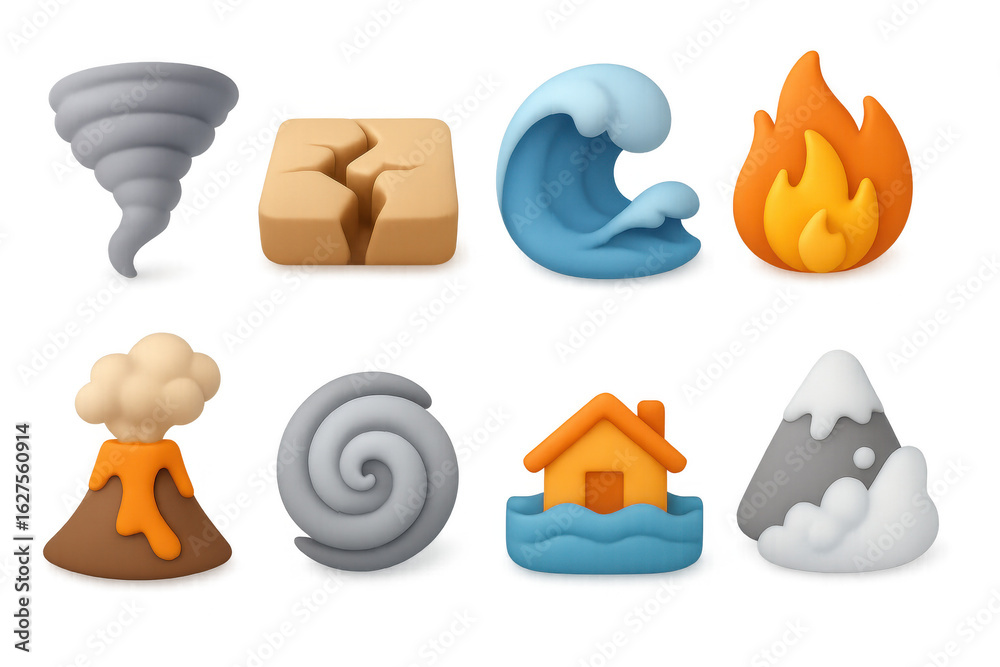 Fototapeta na wymiar - 3d emoji style icons representing natural disasters and weather phenomena.