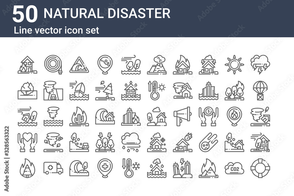 >Fototapety na wymiar>set of 50 natural disaster icons. outline thin line icons such as float, burning, charity, ecology and environment, ecology and environment, farming and gardening, buildings