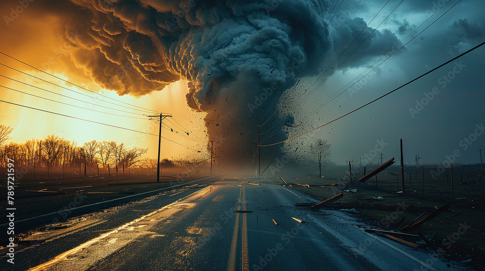Fototapeta na wymiar - furious gigantic tornado in the middle of the road, natural disaster, angry mother earth, climate change.