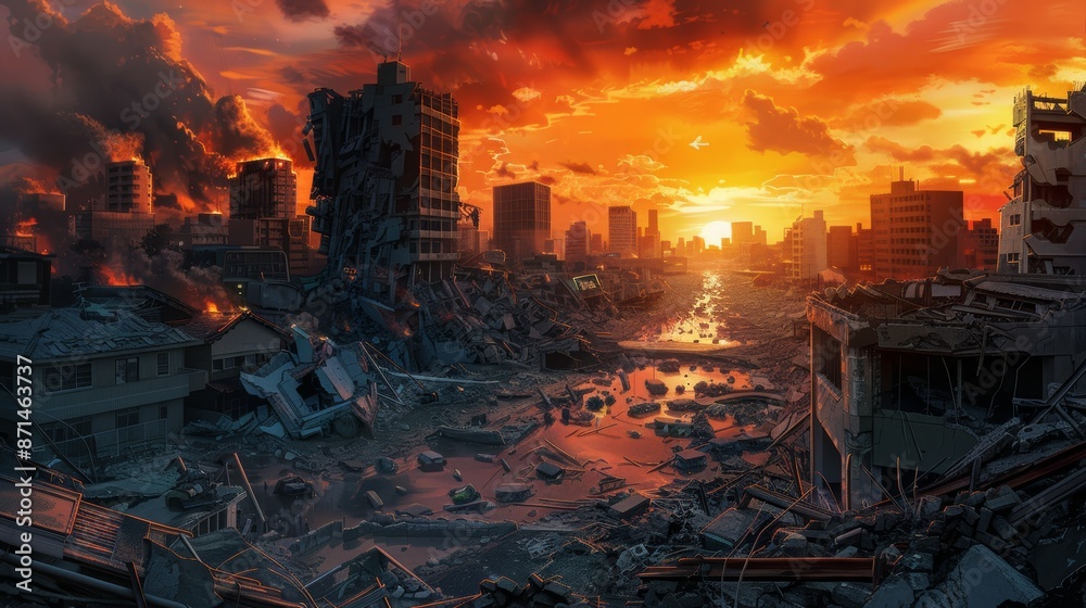 Fototapeta na wymiar - Dramatic of a city destroyed by natural disasters, Digital painting, Anime style..