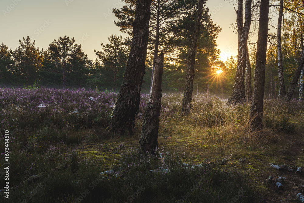 Fototapeta na wymiar - Wczesny poranek w środku mazowieckiego parku, promienie słońca przedzierające się przez leśne drzewa na wrzosowisku.