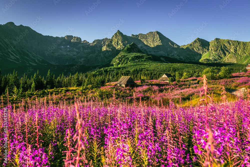 Fototapeta na wymiar - Hala Gąsienicowa w Tatrach Polskich - kwitnąca Wierzbówka Kiprzyca.