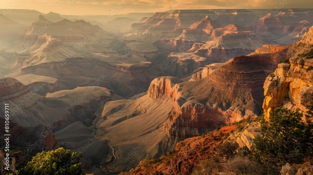 Fototapeta na wymiar - Wspaniały, wielowarstwowy kanion oświetlony złotym światłem wschodzącego słońca, otoczony innymi kanionami, tworząc niezwykłą perspektywę.