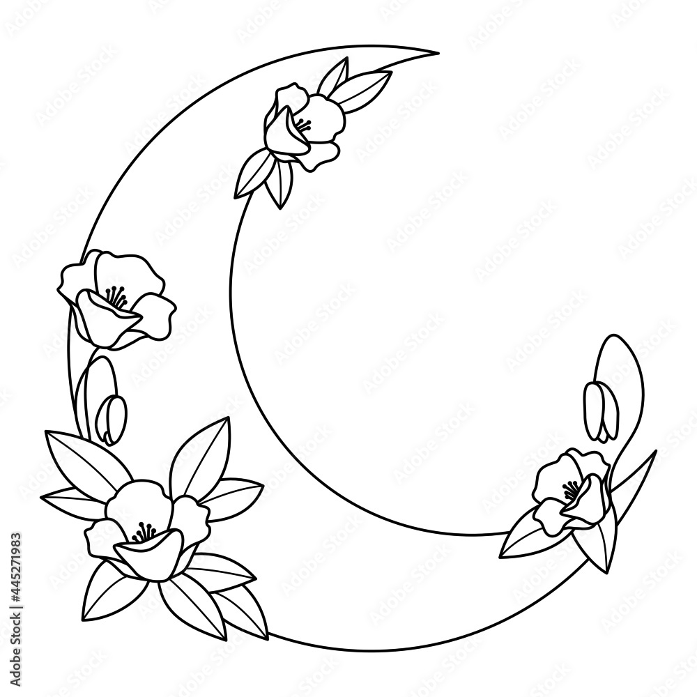 Fototapeta na wymiar - Półksiężyc i kwiaty - dekoracyjna boho ilustracja z miejscem na Twój tekst do wykorzystania jako logo, tatuaż, zaproszenie ślubne, kartka z życzeniami, naklejka..