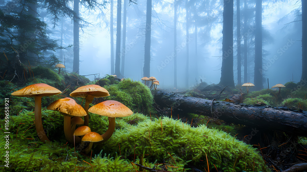 >Fototapety na wymiar>A captivating image of forest fungi in a foggy, dense woodland, with mushrooms sprouting from fallen branches and soft green moss covering the forest floor. Sylvan. Illustration