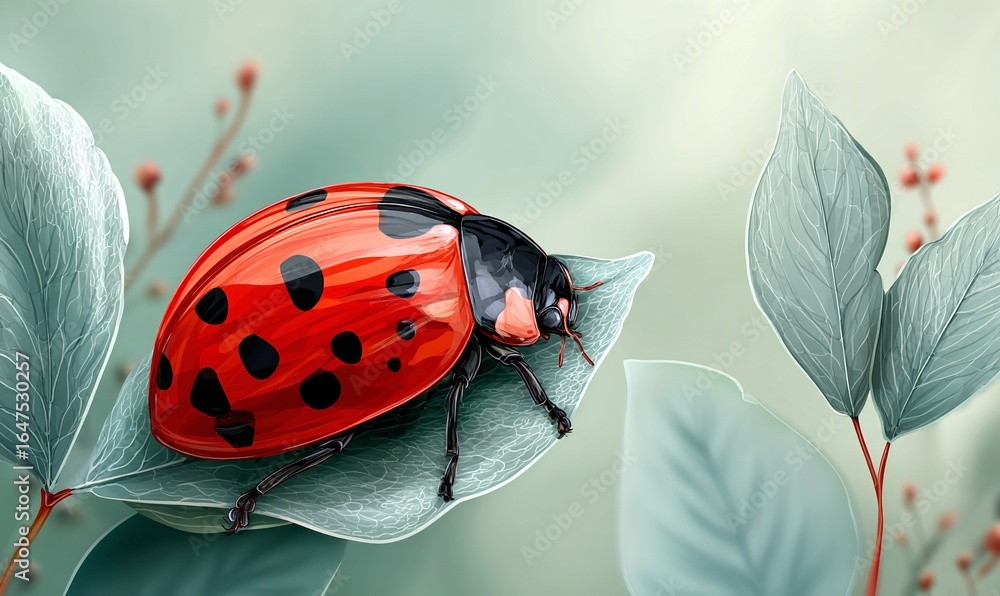 Fototapeta na wymiar - AKWARELA: BIEDRONKA NA ZIELONYM LIŚCIU.
