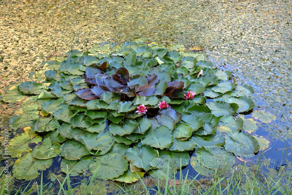 Fototapeta na wymiar - Kwitnące na fioletowo lilie wodne w stawie, widoczna gęsta warstwa rzęsy wodnej na wodzie.