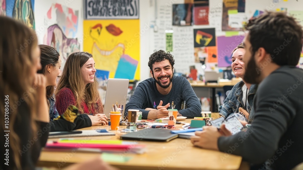Fototapeta na wymiar - Collaborative Creativity: A Group of Engaged Individuals Sharing Ideas and Building Connections in an Inspirational Learning Environment.
