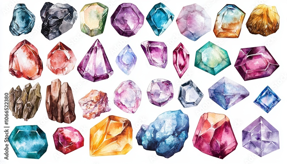 Fototapeta na wymiar - Watercolor Illustration of Various Gemstones in Different Shapes Colors.