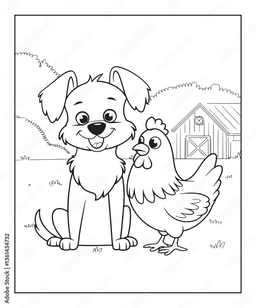 Fototapeta na wymiar - Dog playing with a hen coloring page for kids, black line art vector illustration on white background .