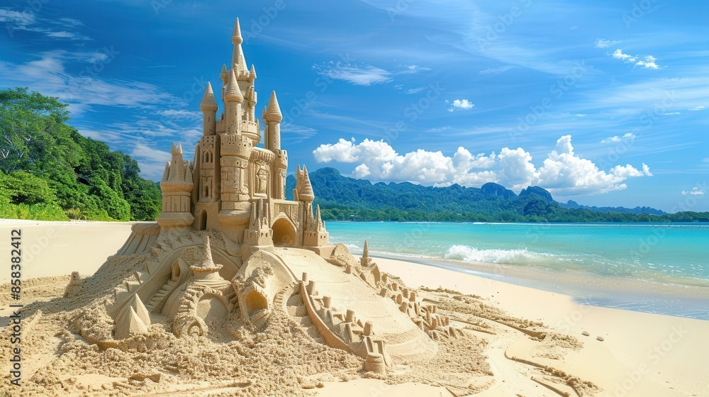 Fototapeta na wymiar - intricate sand castle sculpture on tropical beach summer vacation art.