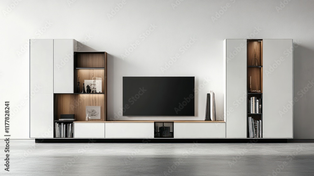 Fototapeta na wymiar - Modern minimalist living room entertainment unit, TV, shelves, books, wall.