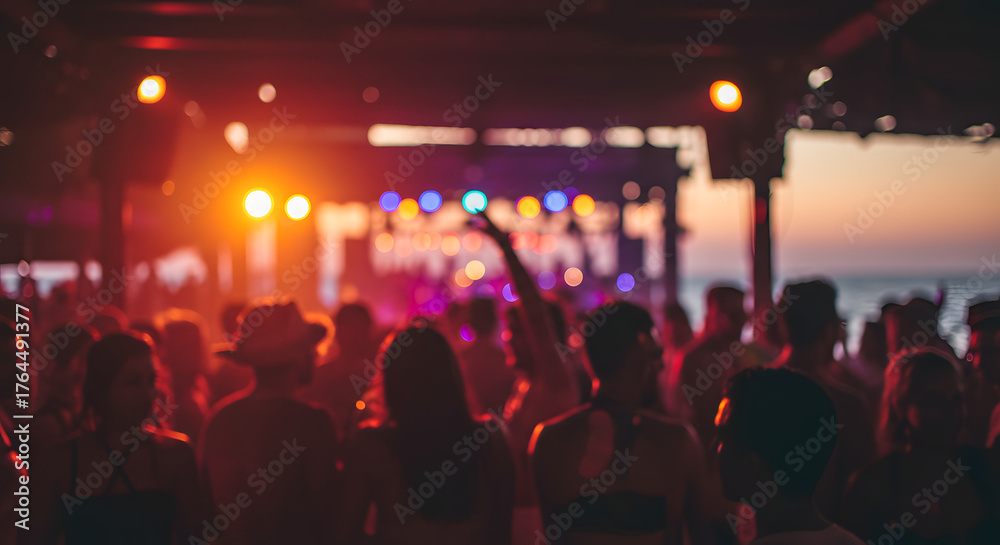 Fototapeta na wymiar - Blurred people having sunset beach party in summer vacation - Defocused image - Concept of nightlife with cocktails and music entertainment.