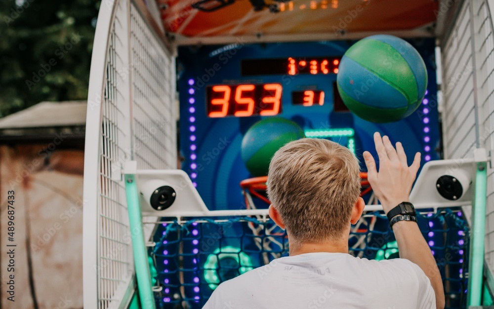 Fototapeta na wymiar - Chłopak rzuca do kosza automatycznego. Urządzenie do gry w koszykówkę.