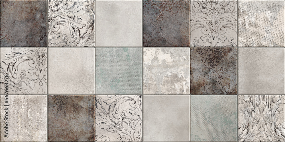 Fototapeta na wymiar - Colorfull wall art mixed digital tiles design for interior home or ceramic tiles design. Texture of rusty metal, cement, concrete, cracks and scuffs with monogram floral ornament decor..