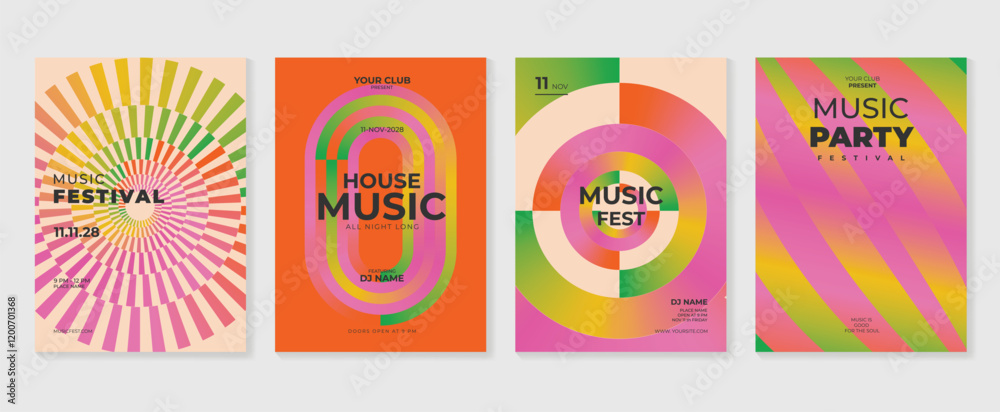 Fototapeta na wymiar - Summer music poster design background vector set. Electro Sound Cover template with vibrant abstract gradient geometric shape, line wave. Design for social media, party, music festival..