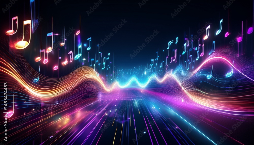 Fototapeta na wymiar - abstract digital music background with glowing neon musical notes and light trails.