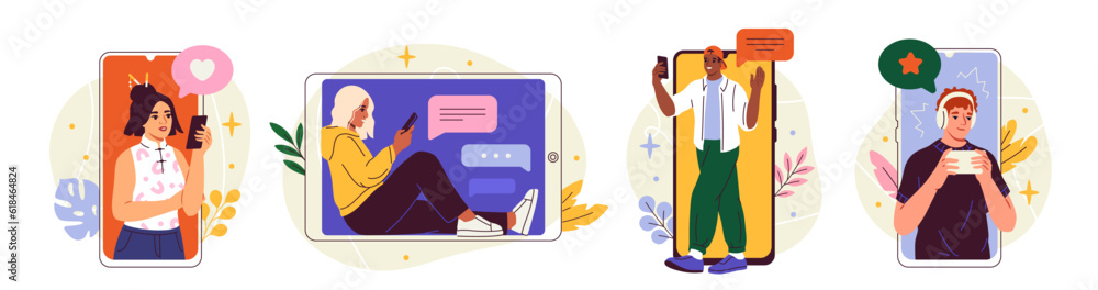 Fototapeta na wymiar - People use smart phones set. Young characters communicate at video call, texting, listening to music in apps and social media. Teenagers send messages. Cartoon flat vector isolated on white background.