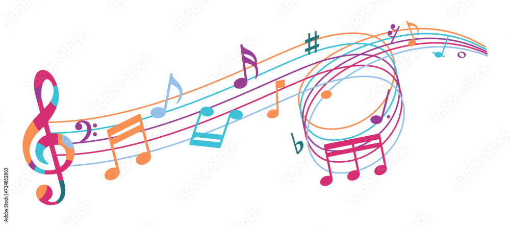 Fototapeta na wymiar - Color music sheet with music notes symbols, flat design vector illustration.