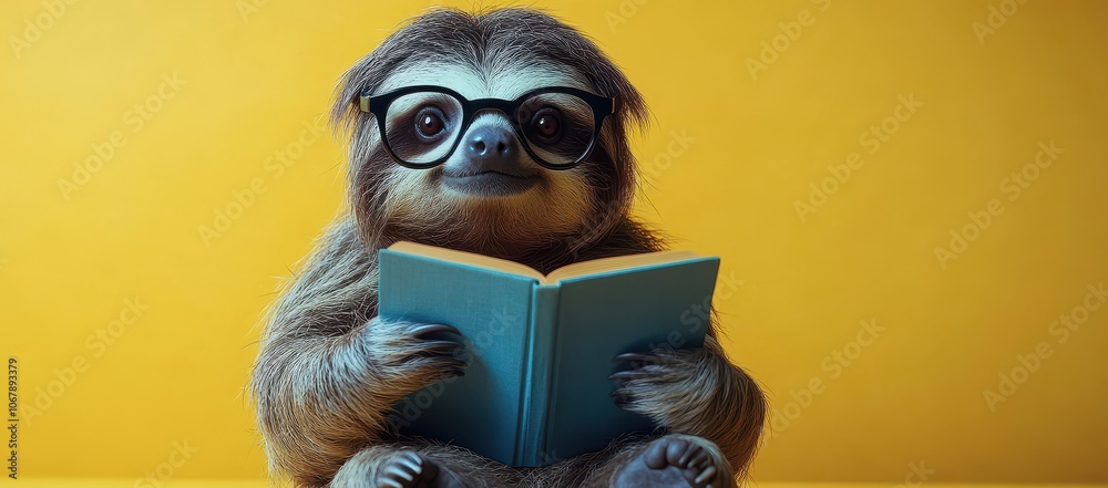 Fototapeta na wymiar - Happy sloth wearing glasses and reading a book against a cozy backdrop.