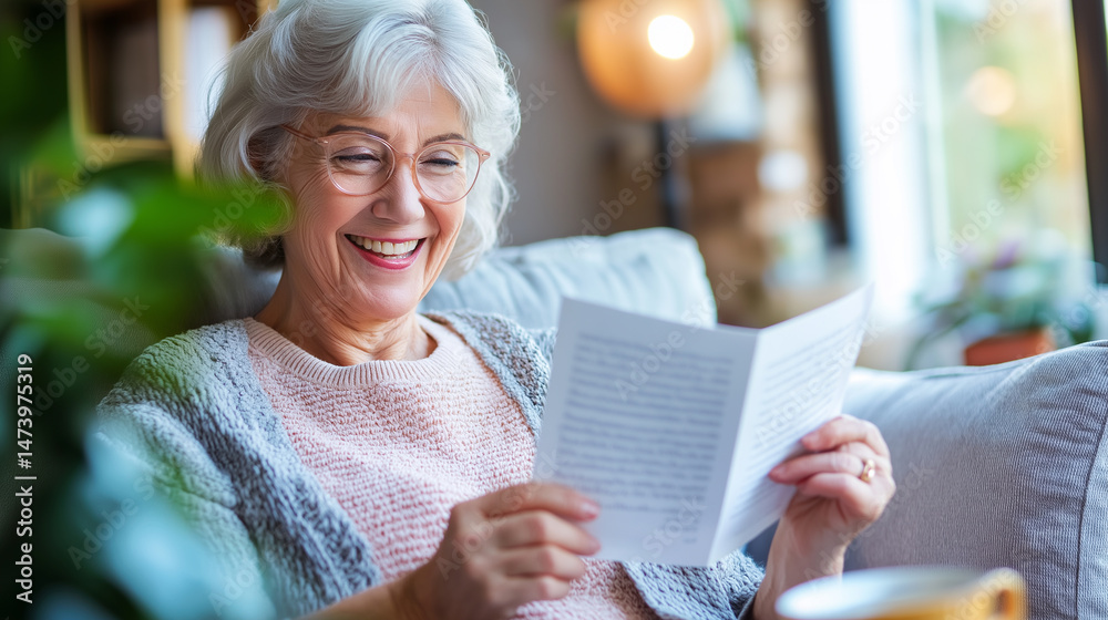 Fototapeta na wymiar - Smiling elderly woman sitting on a couch holding and reading a greeting card in a cozy home setting. .