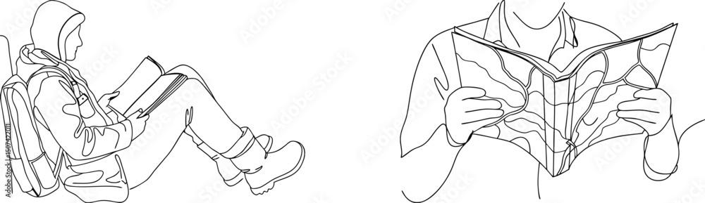 Fototapeta na wymiar - Two people reading illustrated in black and white line art depicting a traveler's journey.