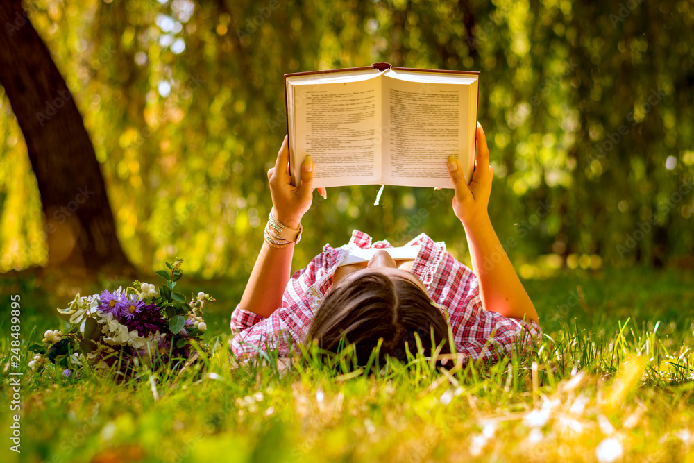 Fototapeta na wymiar - Young woman reading a book in the park with flowers.