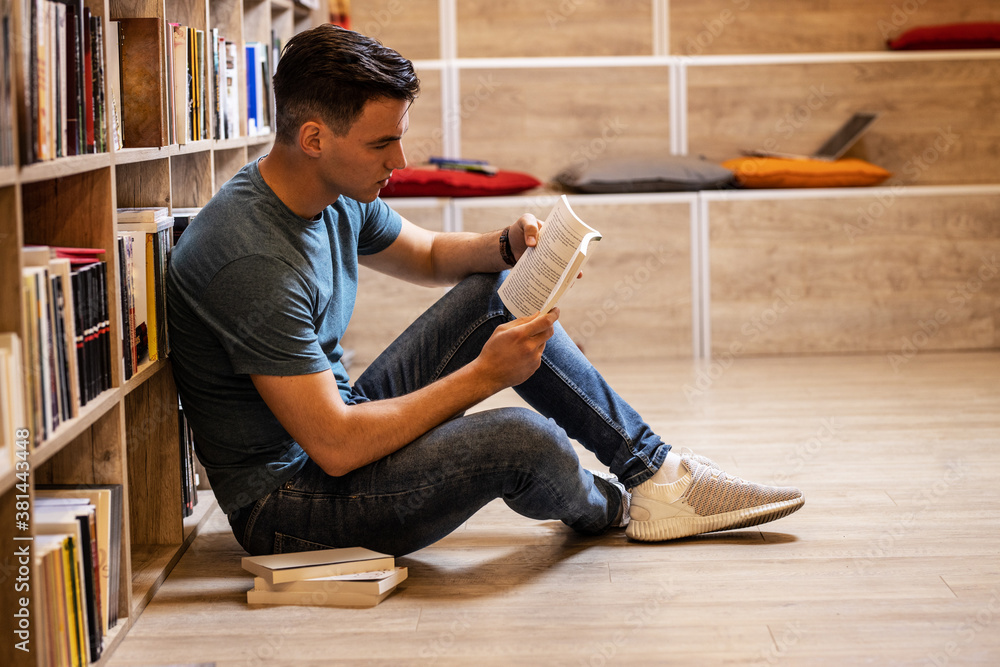 Fototapeta na wymiar - Young male student read and learns by the book shelf at the library.Reading a book. .