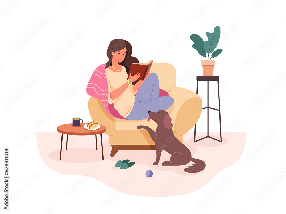 Fototapeta na wymiar - Woman with book in armchair. Rest in cozy sofa apartament, women hobby study read books, comfort home relax, png illustration.