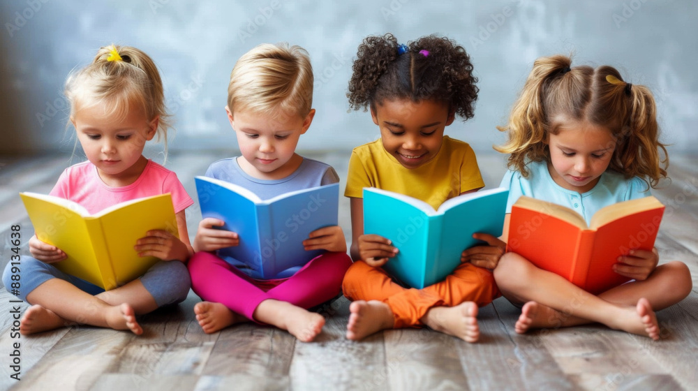 Fototapeta na wymiar - Four diverse children sitting on the floor, engrossed in reading colorful books, promoting education and literacy..