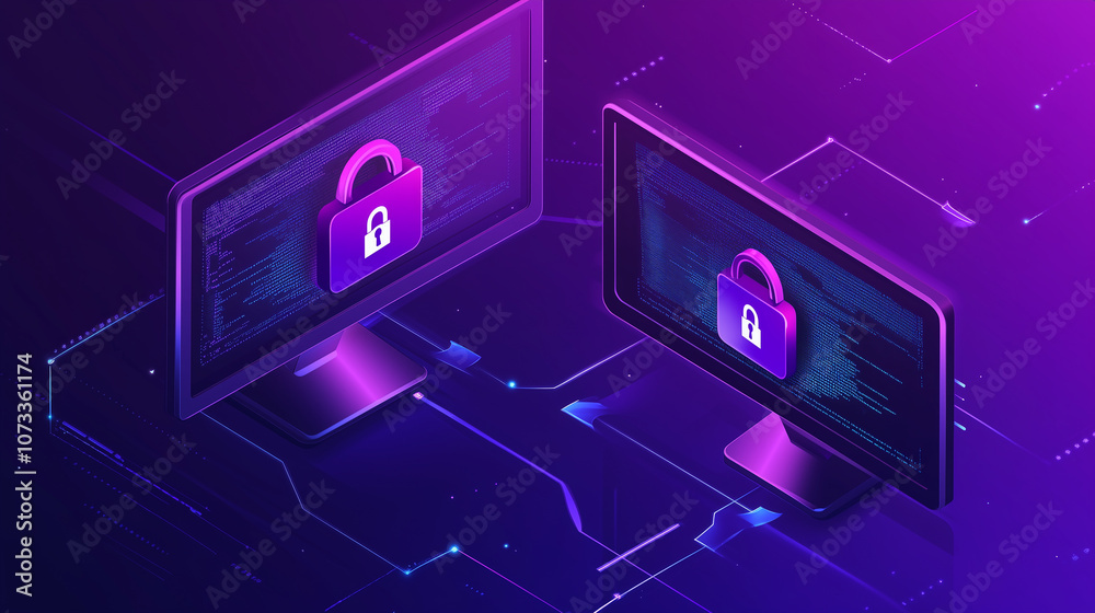 Fototapeta na wymiar - Koncepcja bezpiecznego transferu plików, z komputerami połączonymi strzałkami wskazującymi przesyłanie danych..