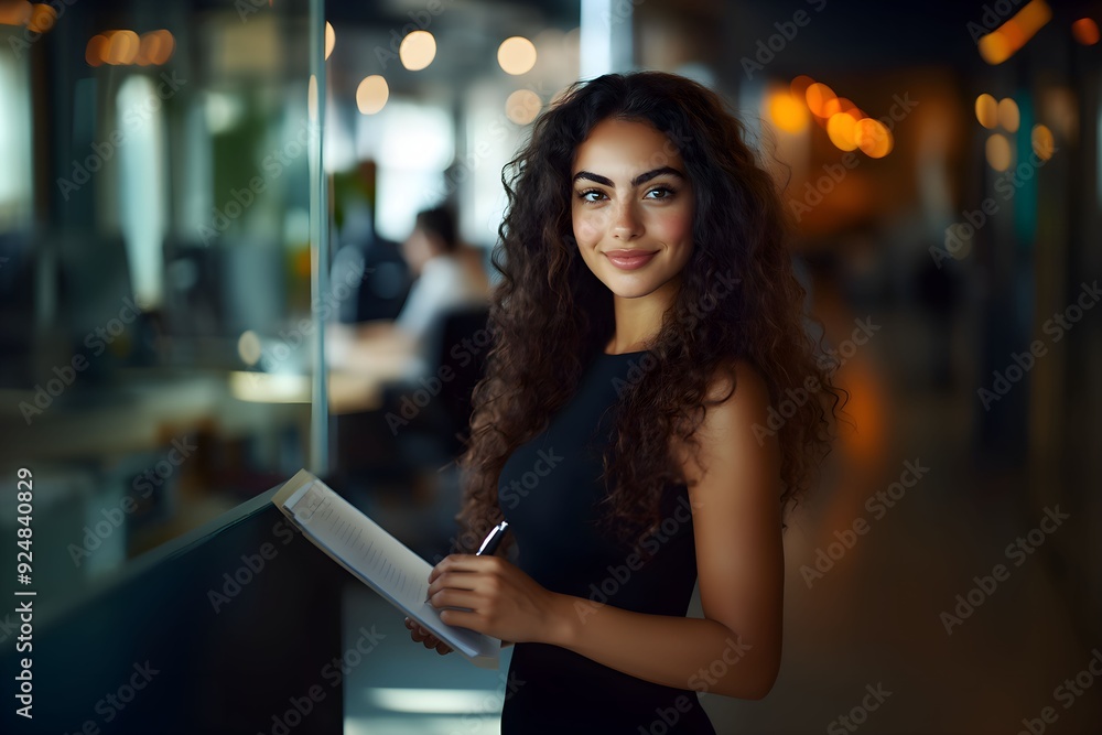 Fototapeta na wymiar - "zbliżenie, europejska kobieta, elegancka, długie kręcone włosy, uśmiechnięta, pewna siebie, korporacyjne biuro, dynamiczna atmosfera, biurka, komputery, współpracownicy, .