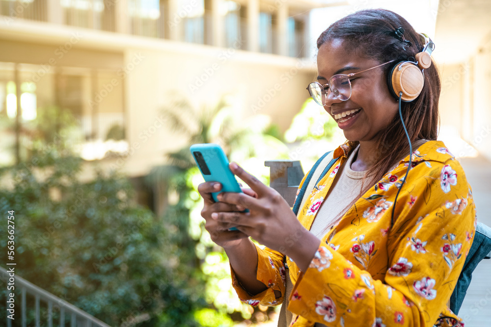 Fototapeta na wymiar - Smiling woman texting at her smartphone with headphones and backpack in the university - happy young hipster student listen to music and looking the mobile phone - positive and cheerful concept.