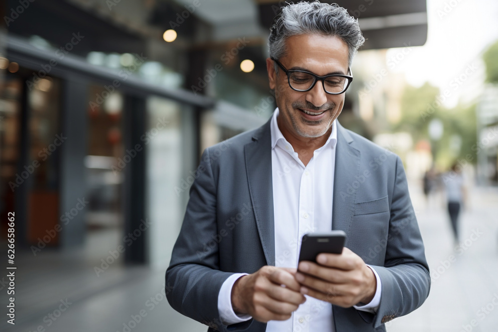 Fototapeta na wymiar - Smiling mature Latin or Indian businessman holding the phone. High quality photo.