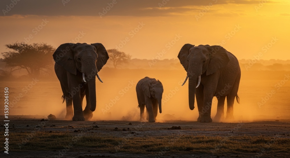 Fototapeta na wymiar - Elephant family silhouette at sunset.