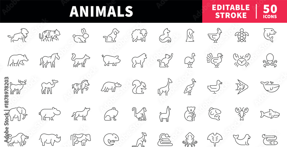 Fototapeta na wymiar - Animals editable line icons set. wildlife and nature symbols in outline style.