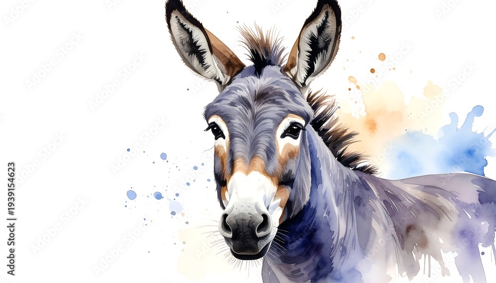 Fototapeta na wymiar - Watercolor painting of a donkey, with textured brush strokes and gentle color washes, on a white background.