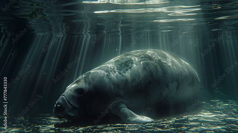 Fototapeta na wymiar - The main subject is a manatee, a large marine mammal with greyish-brown skin, floating or swimming underwater..