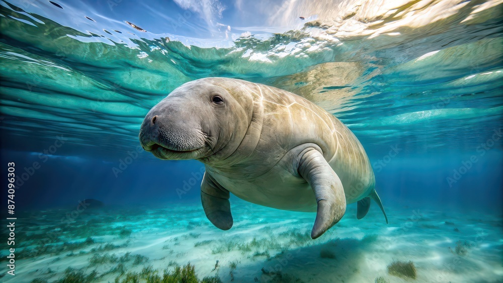 Fototapeta na wymiar - Calm dugong swimming near the ocean surface, Cute marine animal, rare sea mammal, dugong, ocean, surface, marine, animal, mammal.