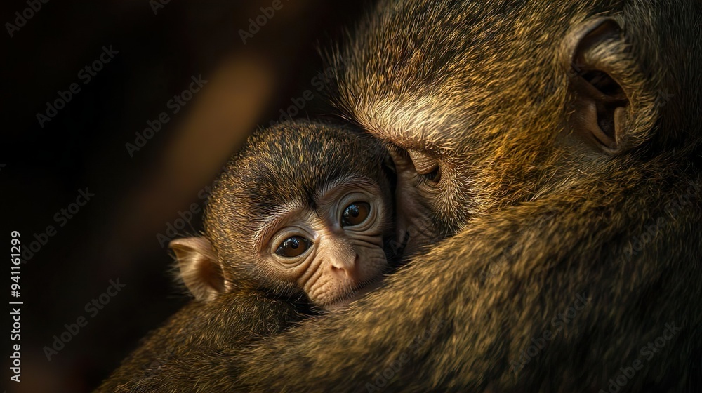 Fototapeta na wymiar - Adorable baby monkey holding onto mother ideal for heartwarming primate-themed images.