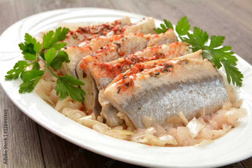 Fototapeta na wymiar - śledzie marynowane z suszonymi pomidorami.