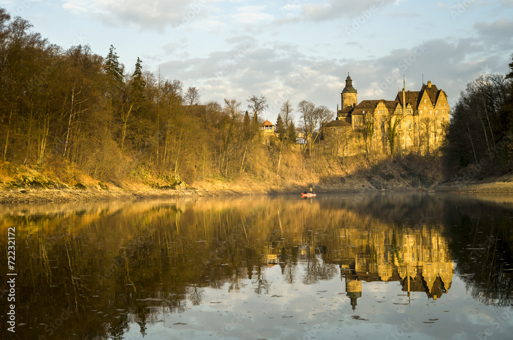 Fototapeta na wymiar - wędkarz na łodzi łowiący ryby na jeziorze pod zamkiem.