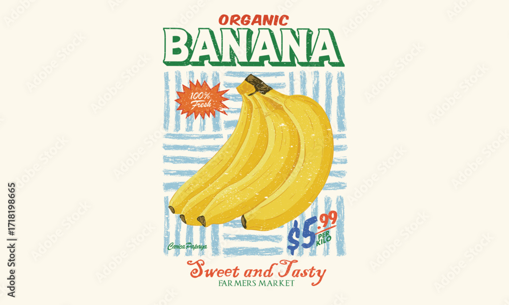 Fototapeta na wymiar - Banana retro art. Nature fruit club print design. Organic food artwork for for t shirt and poster. Fruits of the spirit..