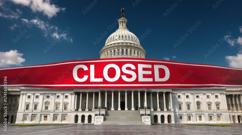 Fototapeta na wymiar - U.S. Capitol with giant closed banner symbolizing American government shutdown and political crisis.